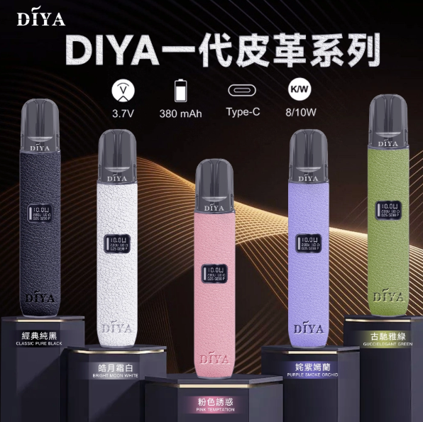 產品型號:DIYA皮革通用一代主機 功率:8W~10W 電池容量:380mAH 充電接口:TYPE-C 適配煙彈:通用一代煙彈