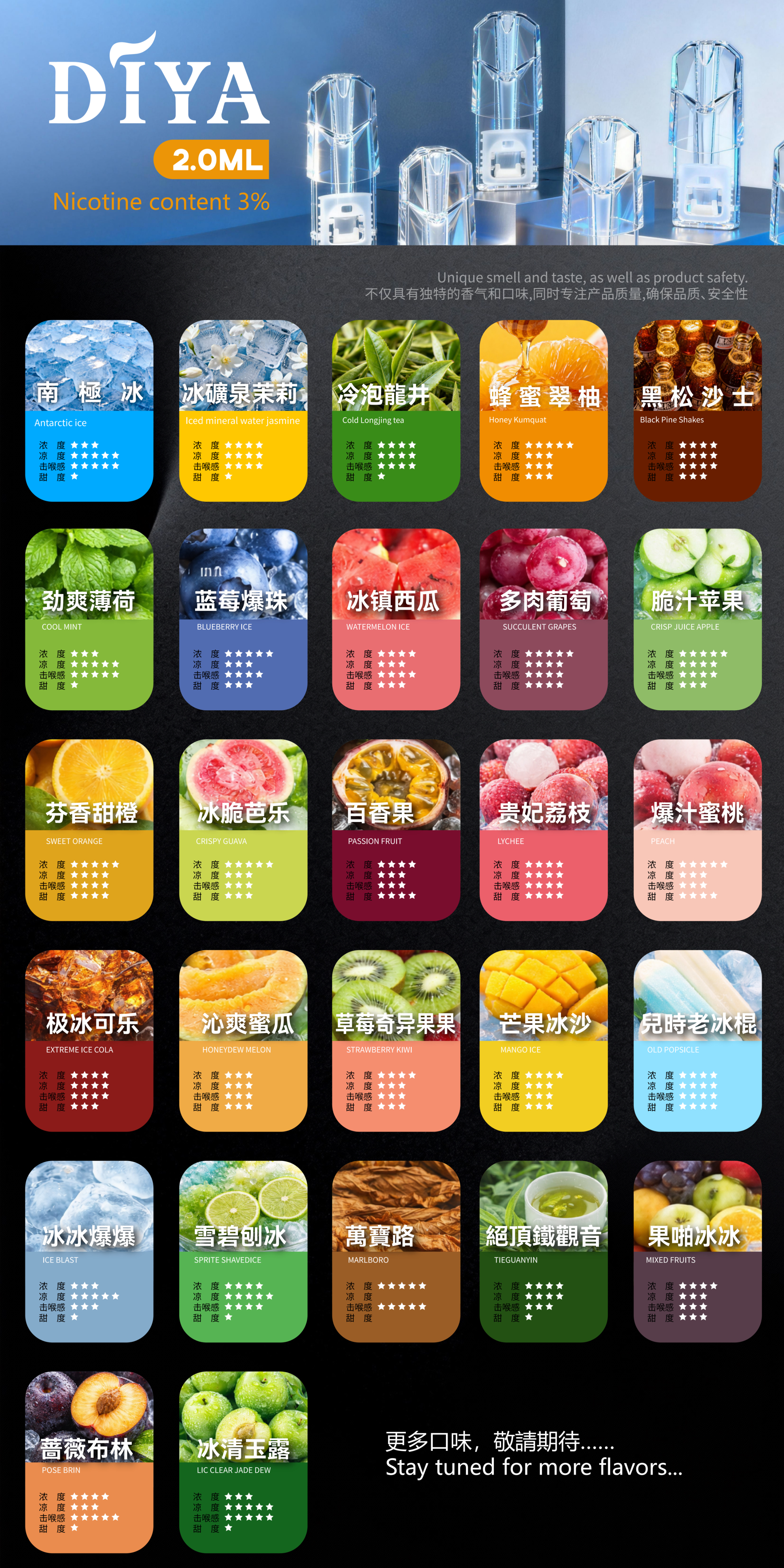 | 口味 | 冰冰爆爆, 芭樂, 西瓜, 哈密瓜, 薄荷, 鐵觀音, 藍莓, 可樂, 荔枝, 水蜜桃, 葡萄, 草莓奇異果, 老冰棍, 蘋果, 甜橙, 雪碧, 萬寶路, 百香果, 芒果, 果啪冰冰, 冰清玉露, 蔷薇布林, 冰礦泉茉莉, 沙士, 龍井, 蜂蜜翠柚, 南極冰 |